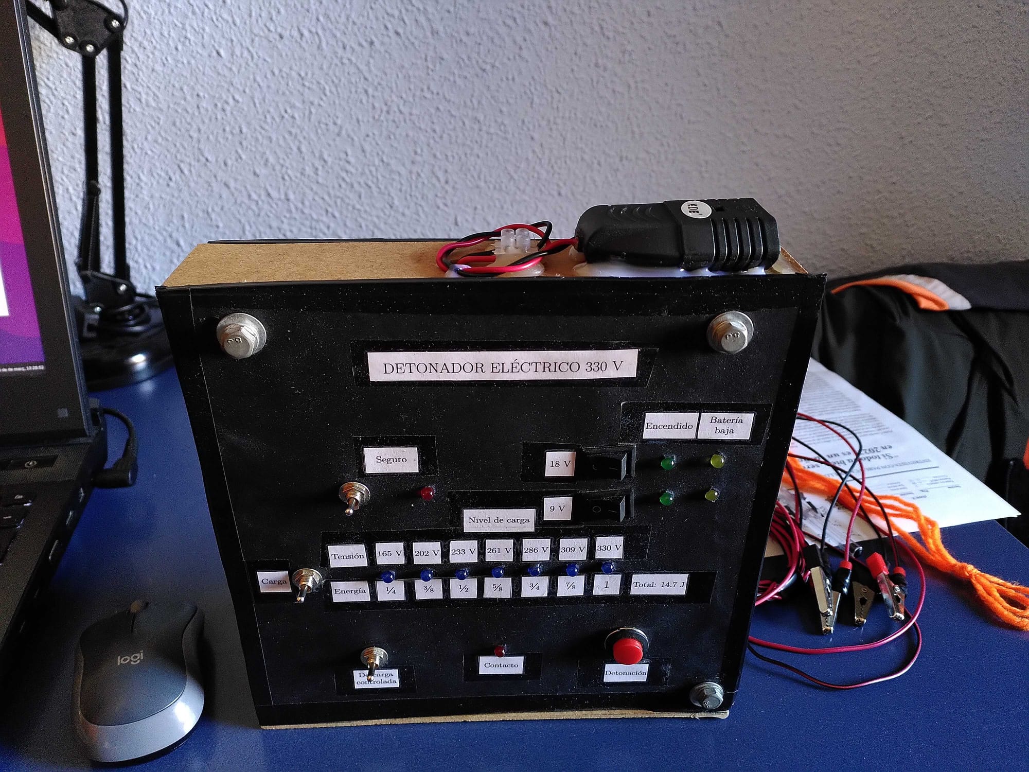 Since our physics degree only covered analog electronics, the entire system was built using discrete components—no microcontrollers yet. The most complex element was an op-amp. The result: a relatively bulky, fully analog igniter capable of boosting 18V to 330V, with LED voltage indicators, safety switches, and a large red firing button. Charging a 270 μF capacitor to 330V took about 50 seconds, it worked!—and it was portable. As a bonus, I still think it looks bad-ass.