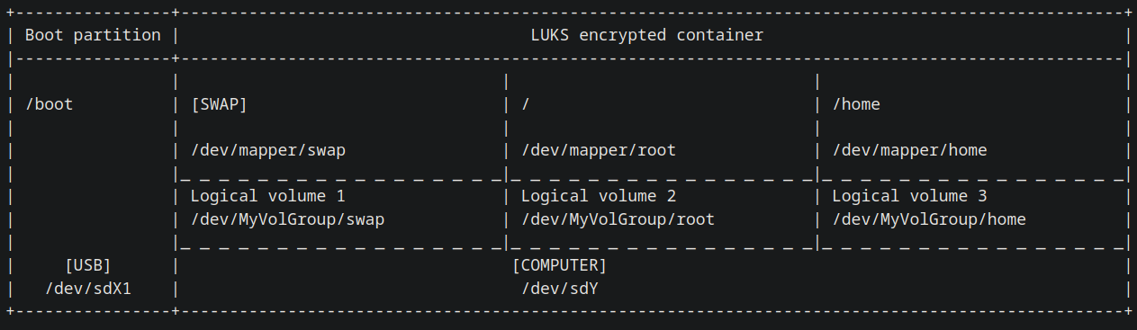 A single LUKS container will be used. Within the container, there will be a LVM (Logical Volume Manager) volume group with three volumes: root, home, swap. LVM is chosen here over conventional partitions, since it solves most of its shortcomings and adds flexibility.